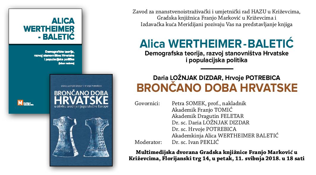Zavod za znanstvenoistraživački i umjetnički rad HAZU u Križevcima, Gradska knjižnica “Franjo Marković” u Križevcima i izdavačka kuća “Meridijani” pozivaju nas u Multimedijsku dvoranu Gradske knjižnice “Franjo Marković” u Križevcima, na Florijanskom trgu 14, u petak, 11. svibnja 2018. u 18 sati na predstavljanje dviju knjiga: Demografska teorija, razvoj stanovništva Hrvatske i populacijska politika Alice Wertheimer-Baletić te Brončano doba Hrvatske, čiji su autori Daria Ložnjak Dizdar i Hrvoje Potrebica. O knjigama će govoriti nakladnica Petra Somek, profesorica, akademik Franjo Tomić, akademik Dragutin Feletar, dr.sc. Daria Ložnjak Dizdar, dr.sc. Hrvoje Potrebica i akademkinja Alica Wertheimer Baletić. Moderator je dr.sc. Ivan Peklić. Ulazak je slobodan.