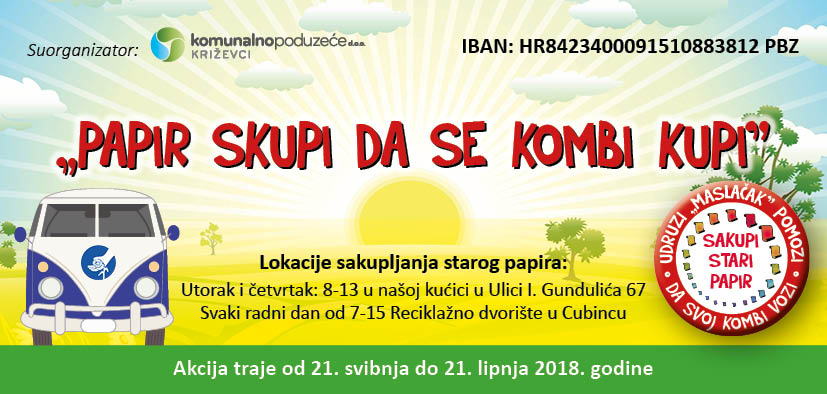 Stari papir (stare novine, časopisi, udžbenici, bilježnice, uredski papir, karton…) mogu se donijeti utorkom i četvrtkom u Gundulićevu 67 u kuću Udruge „Maslačak“ od 9.00 do 13.00 sati ili svaki radni dan na reciklažno dvorište u Cubincu od 7.00 do 15.00 sati sa napomenom da je dovezen papir za Udrugu „Maslačak“ Križevci.