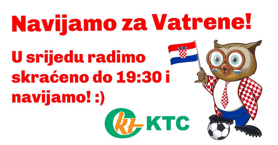 Iz križevačkog trgovačkog lanca javljaju da će u srijedu, 11. srpnja KTC trgovački centri raditi skraćeno – do 19:30 sati, kako bi svi zaposlenici mogli pratiti polufinalnu nogometnu utakmicu Svjetskog prvenstva Hrvatska-Engleska.