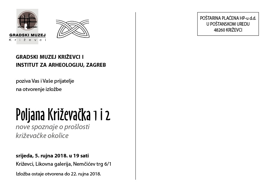 Gradski muzej Križevci i Institut za arheologiju Zagreb pozivaju na otvorenje izložbe “Poljana Križevačka 1 i 2”, koje će se održati u srijedu, 5. rujna 2018. u Likovnoj galeriji na Nemčićevom trgu 6/1. tom prilikom bit će predstavljene nove spoznaje o prošlosti križevačke okolice. Izložba ostaje otvorena do 22. rujna, a ulazak je slobodan.