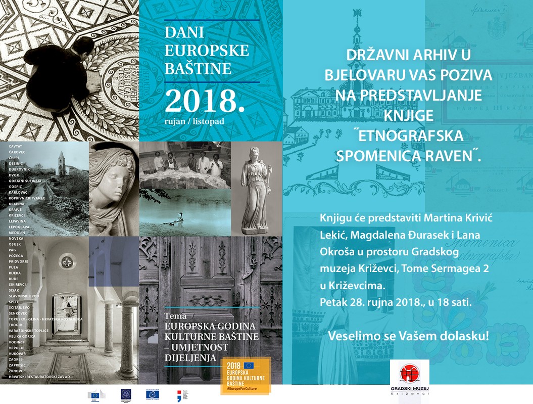 Jedna od manifestacija Dana europske baštine održat će se i u Gradskom muzeju Križevci, gdje će u suradnji s Državnim arhivom u Bjelovaru, u petak 28. rujna u 18 sati, u prostorima Likovne galerije na Nemčićevom trgu 6, biti promovirana knjiga Etnografska spomenica Raven.