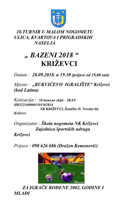 Zajednica športskih udruga Križevci i Škola nogometa NK Križevci organiziraju 10. Turnir u malom nogometu ulica, kvartova i prigradskih naselja, za igrače rođene 2002. godine i mlađe. Turnir će se održati na Bukvićevom igralištu, na umjetnoj podlozi.