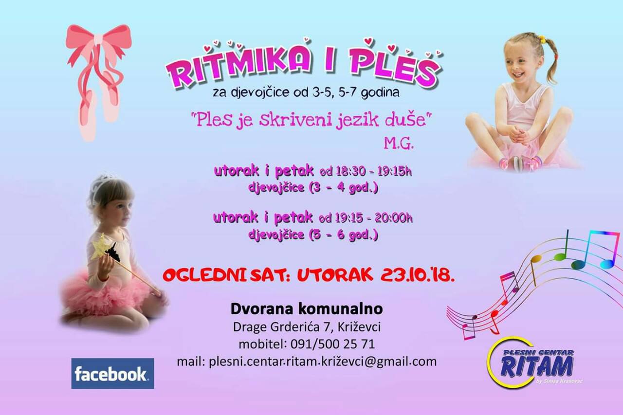 Ritmika i ples za djevojčice održavat će se u dvorani Komunalnog poduzeća u ulici Drage Grdenića 7. Djevojčice od 3-4 godine starosti utorkom i petkom od 18:30 do 19:15 sati, a djevojčice od 5-6 godina utorkom i petkom od 19:15 do 20 sati. Ogledni sat za ritmiku i ples održat će se u utorak, 23. listopada. Više informacija može se zatražiti e-poštom ili na broj mobitela 091/500-25-71.