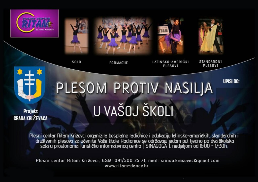 Plesni centar Ritam Križevci ove jeseni priprema bogatu ponudu u plesnoj edukaciji. Tako su prije tjedan dana pokrenuli projekt “Plesom protiv nasilja” namijenjen učenicama i učenicima osnovnih i srednjih škola. Besplatne plesne radionice i edukacija latino-američkih, standardnih i društvenih plesova održavat će se jedanput tjedno po dva školska sata u dvorani Turističkog informativnog centra, nedjeljom od 16:00 – 17:30 sati.