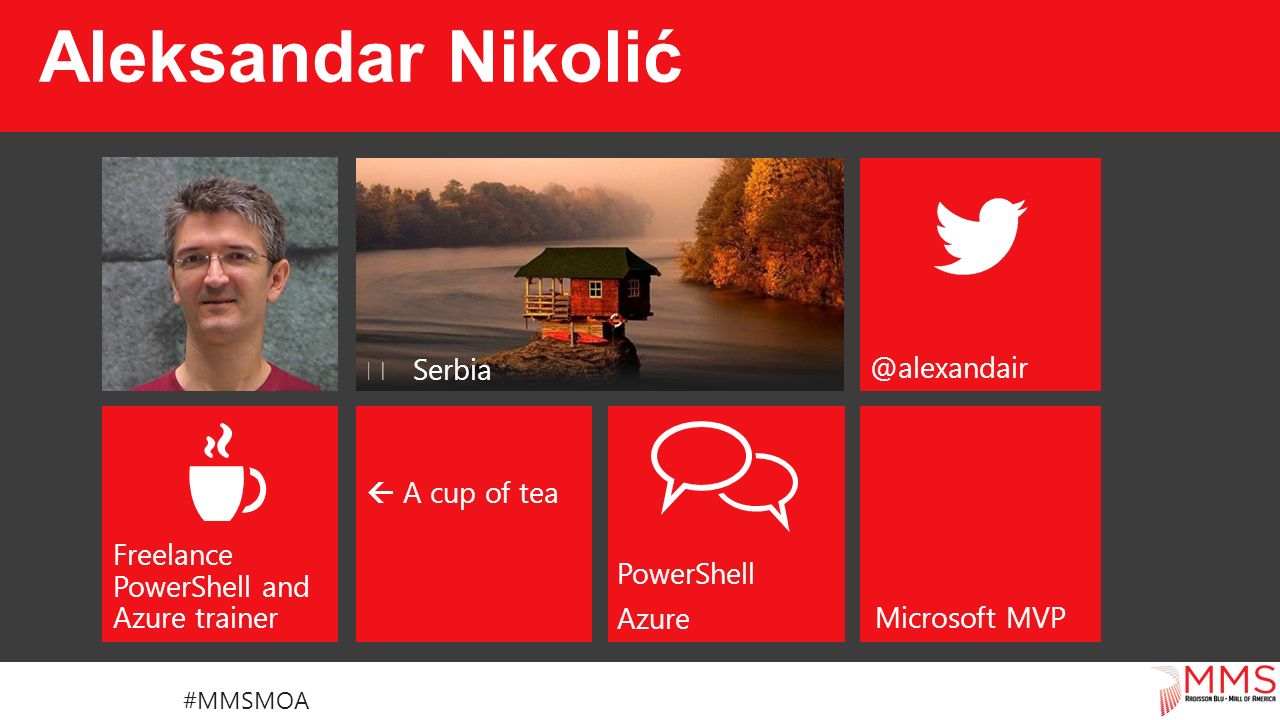 Aleksandar Nikolić je Microsoft Most Valuable Professional (MVP) za Cloud and Datacenter Management i Microsoft Azure, jedan je od osnivača PowerShellMagazine.com, i community manager portala PowerShell.com. 17 godina je radio kao sistem administrator. Proteklih 7 godina drži PowerShell i Azure treninge gdje god se ukaže prilika (Hrvatska, Island, Norveška, Finska, Švedska, SAD, Nizozemska, Srbija…). Česti je predavač na raznim IT konferencijama (Microsoft Ignite, Microsoft TechDays, PowerShell Conference Europe, KulenDayz, NTK, MMS, NIC, IT/Dev Connections, ExpertsLive Europe/USA…). Vrhunac dosadašnje predavačke karijere mu je PowerShell trening koji je održao Microsoftovim zaposlenicima u Microsoftovu kampusu u Redmondu.