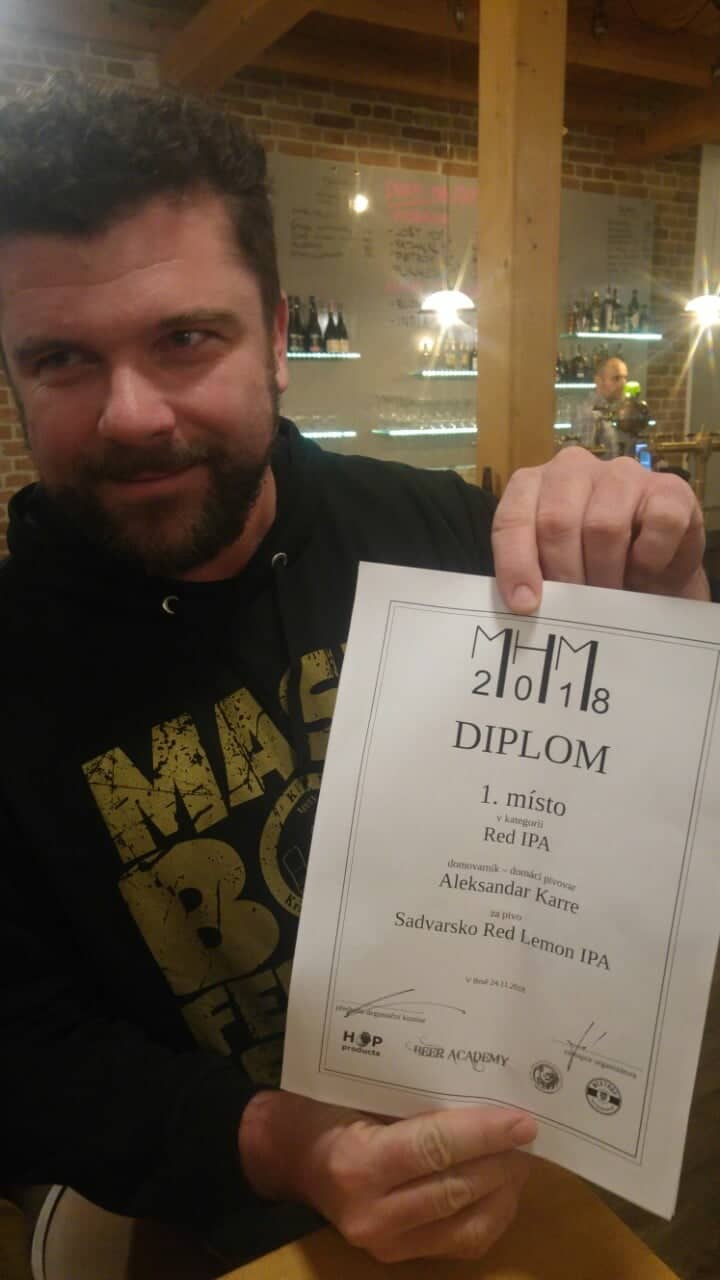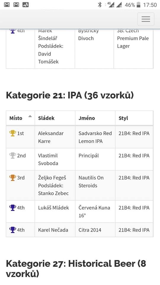 Na Moravian Homebrewers Meetingu u Brnu u Češkoj ovog vikenda održalo se i natjecanje kućnih pivara u kojem smo opet zabilježili vrijedan uspjeh. Između 122 prijavljena piva dva su naša piva odnijela medalje, jedno zlato i jednu broncu. Aleksandar Karré iz Križevačke udruge pivara bio je najbolji u kategoriji IPA sa svojom red IPA-om Sadvarsko Red Lemon IPA dok je Željko Fegeš iz Udruge pivara sjever sa svojim co-brewerom Stankom Zebecom bio treći u istoj kategoriji s opet red IPA-om Nautilis On Steroids. Ništa čudno, Češkoj su organizirali natjecanje u četiri kategorije od kojih je jedna upravo BJCP 21B4, dakle red IPA.