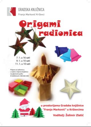 Ovaj tjedan se u Gradskoj knjižnici “Franjo Marković” Križevci održava mali tečaj origamija za djecu (baze, čitanje dijagrama, origami). Prvi termin je u ponedjeljak, 7. siječnja, od 16 do 17 sati, drugi u srijedu, 9. siječnja, od 10 do 11 sati, a treći u petak, 11. siječnja, od 10 do 11 sati. Voditelj radionice je Želimir Zlatić.