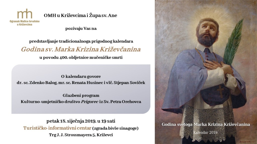 Ogranak Matice hrvatske u Križevcima i Župa sv. Ane pozivaju na predstavljanje tradicionalnoga prigodnog kalendara “Godina sv. Marka Krizina Križevčanina” u povodu 400. obljetnice mučeničke smrti, koje će se održati u petak 18. siječnja 2019. u 19 sati u Turističko-informativnom centru (zgrada bivše sinagoge), Trg J. J. Strossmayera 5, Križevci.