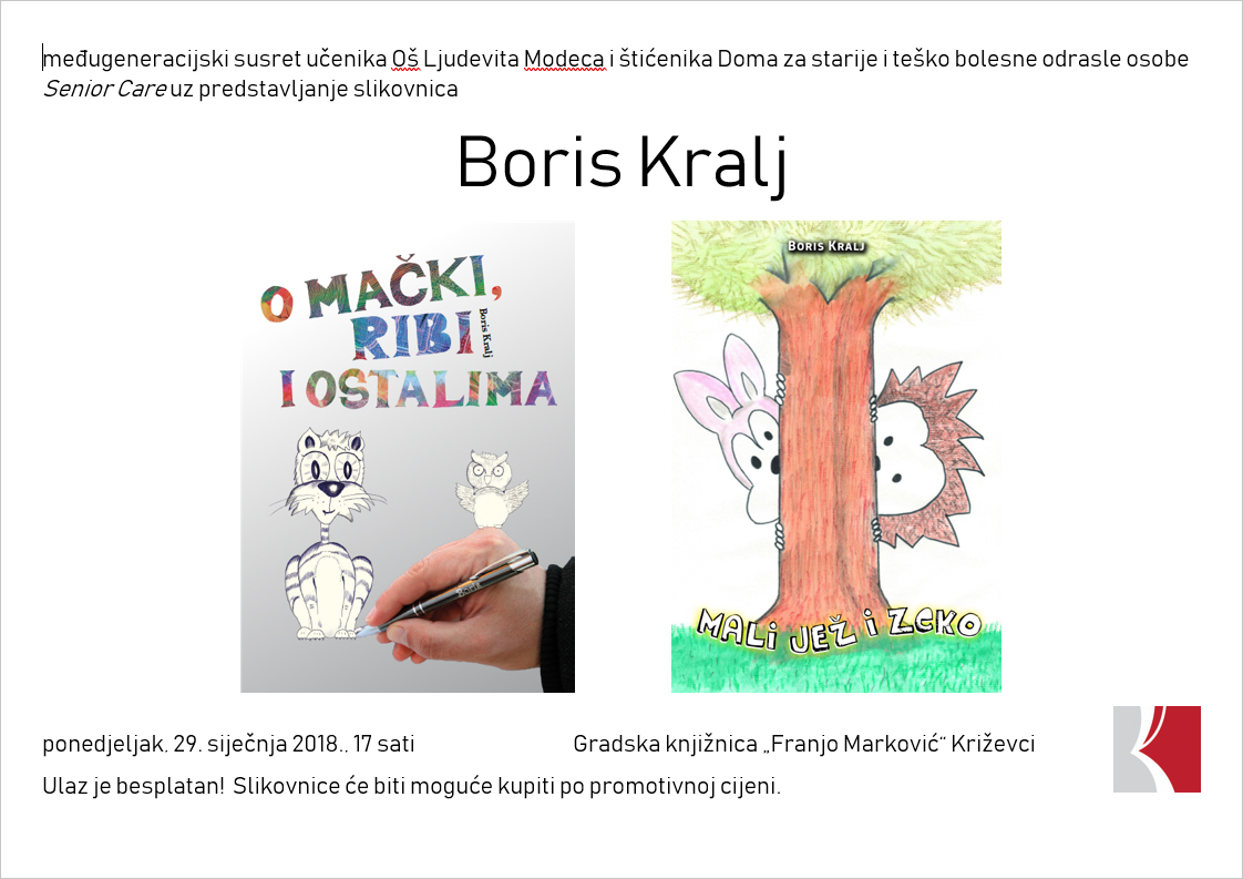 Gradska knjižnica „Franjo Marković“ Križevci poziva na međugeneracijski susret učenika Osnovne škole Ljudevita Modeca i štićenika Doma za starije i teško bolesne odrasle osobe Senior Care, uz promociju dviju slikovnica Borisa Kralja – „Mali jež u zeko“ te „O mački, ribi i ostalima“, dobitnici nagrade dječjeg žirija Ovca u kutiji 2018.