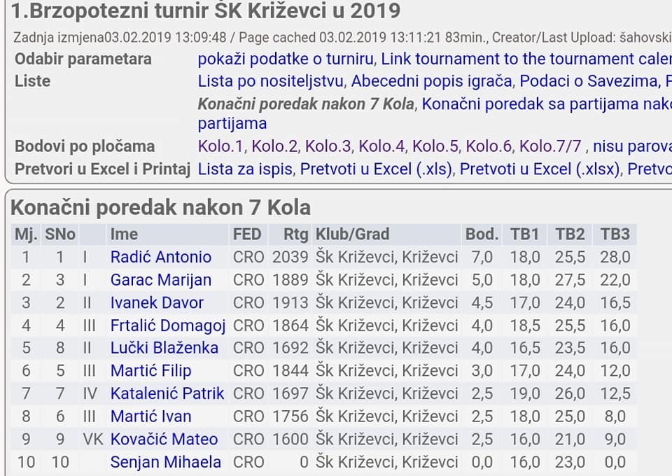Šahovski klub Križevci organizirao je u nedjelju, 3. veljače, brzopotezni klupski turnir na kojem je nastupilo deset igrača i igračica u sedam kola. Uvjerljivo je pobijedio Antonio Radić sa 7 bodova ispred Marijana Garca s 5 i Davora Ivaneka s 4.5 boda.