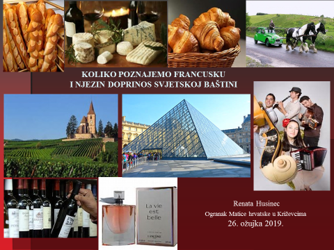 Gradska Knjižnica Franjo Marković Križevci poziva na javno predavanje mr. Renate Husinec pod nazivom “Koliko poznajemo Francusku i njezin doprinos svjetskoj baštini”, koje će se održati u utorak 26. ožujka u 18 sati u multimedijskoj dvorani Gradske knjižnice. Ulazak na predavanje je slobodno.