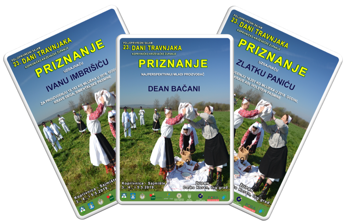 U sklopu svečanog otvorenja manifestacije 23. Dani travnjaka Koprivničko-križevačke županije proglašeni su najbolji proizvođači kravljeg i kozjeg mlijeka te najperspektivniji mladi proizvođač mesa i mlijeka s područja Županija, kao i po prvi puta najbolji proizvođači silaže. Priznanja i nagrade sponzora uručili su im župan Darko Koren i zamjenik župana ujedno i predsjednik Organizacijskog odbora Darko Sobota, predsjednik Županijske skupštine Željko Pintar, Ivica Vranić iz Hrvatske agencije za poljoprivredu i hranu te državni tajnik u Ministarstvu poljoprivrede Tugomir Majdak.