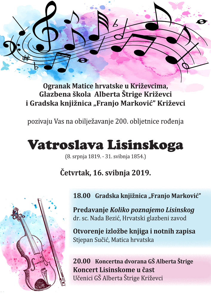 Ogranak Matice hrvatske u Križevcima, Glazbena škola Alberta Štrige i Gradska knjižnica „Franjo Marković” pozivaju u četvrtak 16. svibnja na obilježavanje 200. obljetnice rođenja hrvatskoga skladatelja i autora prve nacionalne opere Vatroslava Lisinskoga (8. srpnja 1819. – 31. svibnja 1854.).