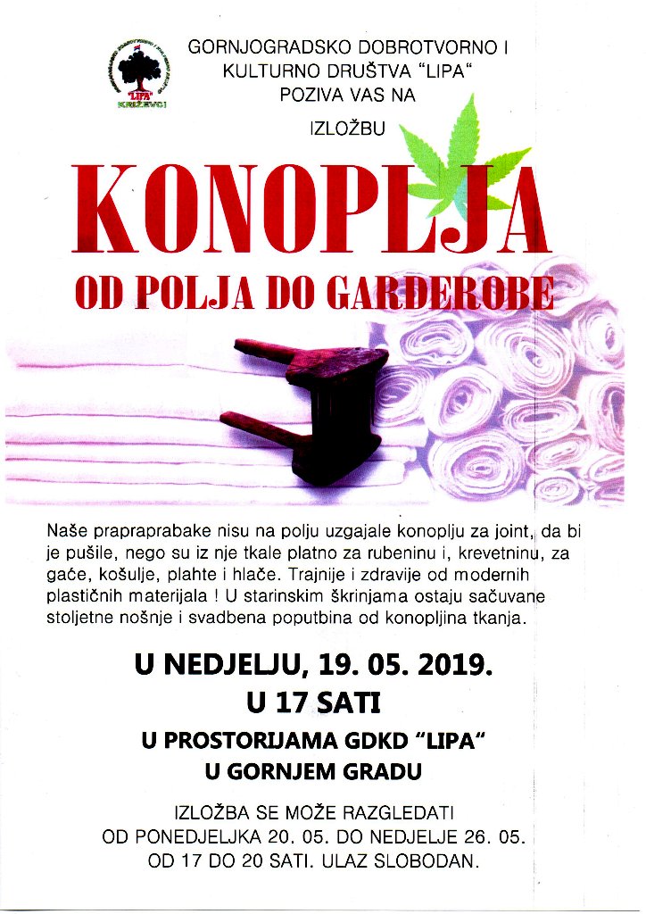 KRIŽEVCI – Sve se više govori i piše o uzgoju konoplje, doduše medicinske i rekreativne, no još su živa sjećanja o uzgoju industrijske konoplje za odjeću, nošnju, rubeninu i krevetninu. O tome i proizvodima od konopljina platna Gornjogradsko dobrotvorno i kulturno društvo „Lipa“ sprema izložbu u Domu sv. Marka u Gornjem gradu sa otvorenjem u nedjelju, 19. svibnja u 17 sati, a moći će se razgledati do nedjelje 26. svibnja.