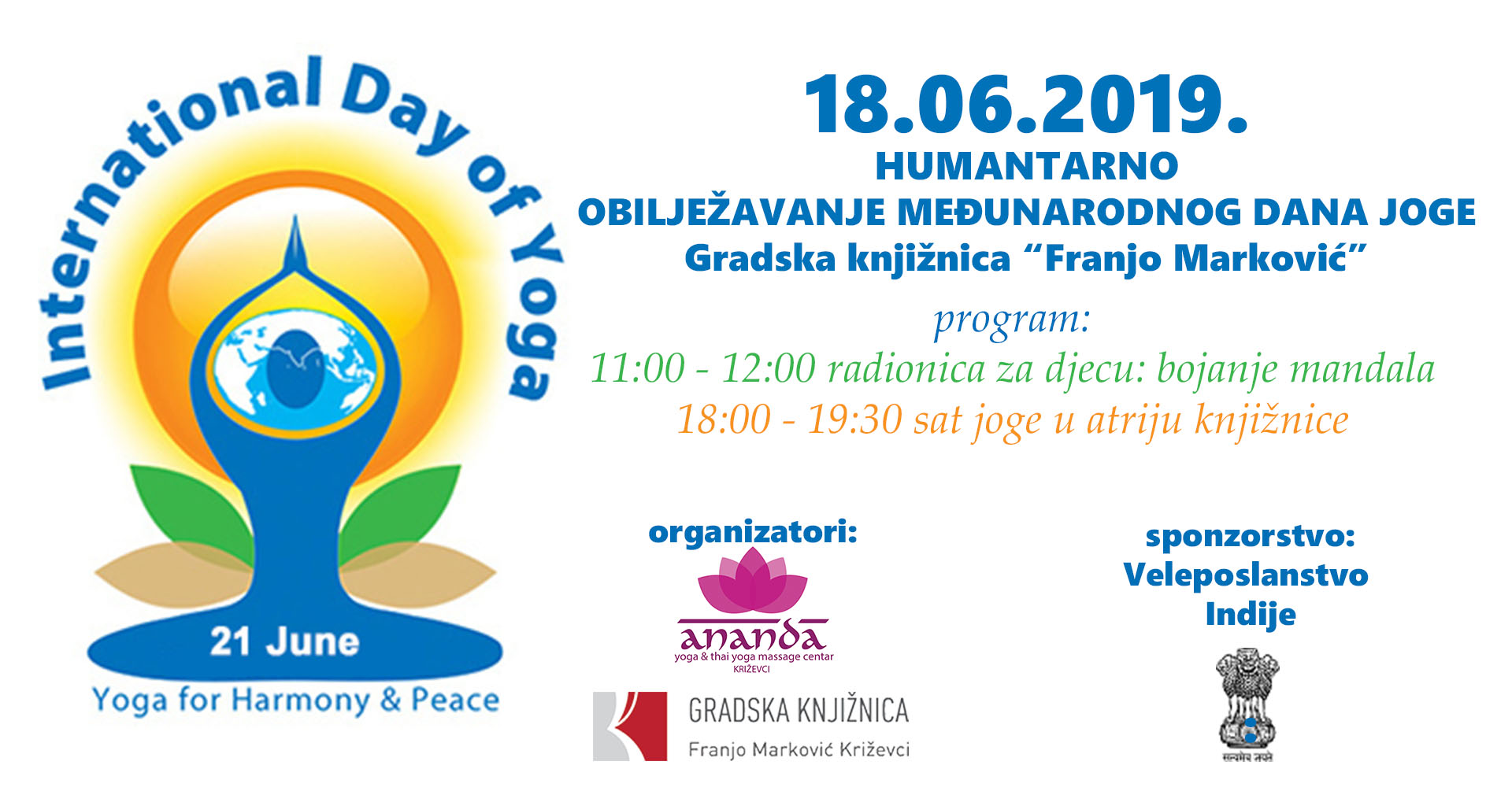 Ananda yoga & thai massage centar Križevci i Gradska knjižnica „Franjo Marković” Križevci pozivaju u utorak, 18. lipnja 2019. na obilježavanje Međunarodnog dana joge. Ujutro u 11 sati održat će se radionica bojanja mandala na dječjem odjelu Gradske knjižnice, a u 18:00 besplatan sat joge u predivnom atriju knjižnice.