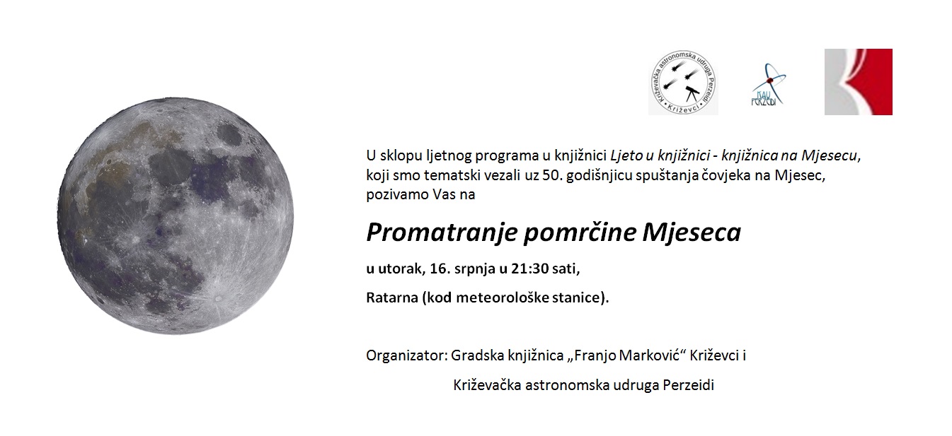 Spomenut ćemo još i to da je ovo promatranje pomrčine Mjeseca samo uvod u obilježavanje 50. obljetnice spuštanja ljudi na Mjesec koje ćemo održati u Gradskoj knjižnici “Franjo Marković” u petak, 19. srpnja navečer, baš na 50. godišnjicu ulaska “Apolla 11” u orbitu oko Mjeseca, u društvu s Antom Radonićem, koji je od 1972. do umirovljenja 2017. u Tehničkom muzeju u Zagrebu bio voditelj planetarija s astronautikom, gdje je redovito održavao predavanja za školske grupe i građane u cilju popularizacije astronomije i astronautike, a također je i suosnivač, stalni i najvjerniji stručni suradnik emisije za popularizaciju astronomije i astronautike Andromeda Hrvatskoga radija koju još i danas redovito možemo slušati svakoga utorka navečer. No, na to predavanje još ćemo posebno podsjetiti sljedećih dana. I promatranje pomrčine Mjeseca i predavanje Ante Radonića pod naslovom Ljudi na Mjesecu besplatno je za sve zainteresirane posjetitelje. Dobro došli!