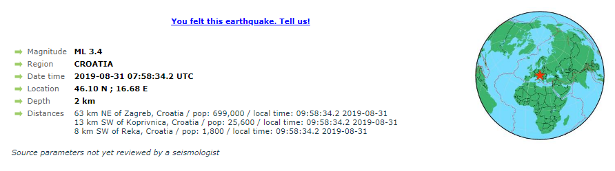 Dosta snažno podrhtavanje tla jutros je na nekoliko trenutana prekinulo uobičajene rutine građana križevačkog i koprivničog područja. Da budemo precizniji, epicentar potresa bio je u Donjari kod Lepavine, magnitude 3,4 po Richteru, 13 kilometara jugozapadno od Koprivnice, 10 kilometara od Križevaca i to na dubini na dva kilometra.