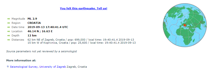 Ovo je drugi potres u 2 tjedna na području između Koprivnice i Križevaca. Prvi se zbio 31.8. , a bio je magnitude 3.2 po Richteru.