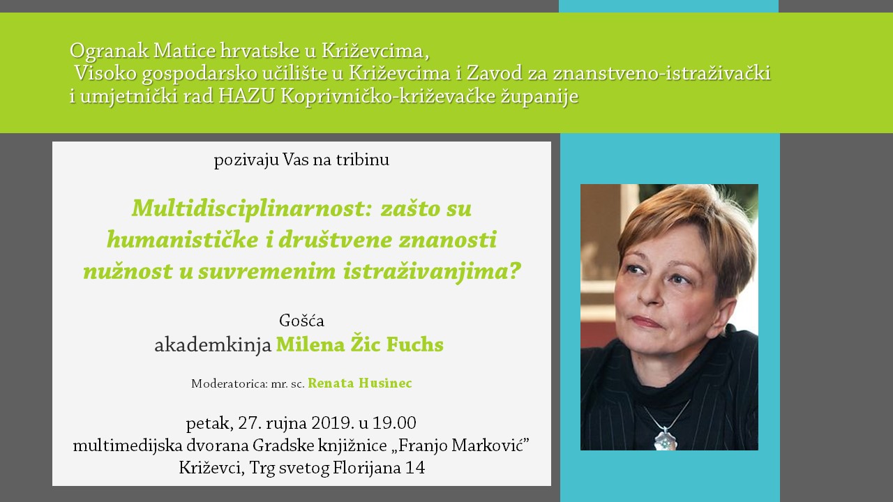 Ogranak Matice hrvatske u Križevcima, Visoko gospodarsko učilište u Križevcima i Zavod za znanstveno-istraživački i umjetnički rad Hrvatske akademije znanosti i umjetnosti Koprivničko-križevačke županije pozivaju u petak 27. rujna 2019. u 19 sati u multimedijsku dvoranu Gradske knjižnice „Franjo Marković” na tribinu Multidisciplinarnost: zašto su humanističke i društvene znanosti nužnost u suvremenim istraživanjima. Gošća će biti akademkinja Milena Žic Fuchs.