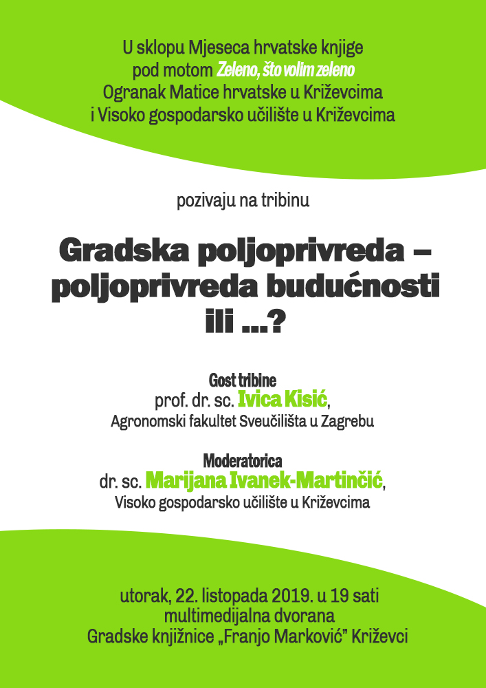 U sklopu Mjeseca hrvatske knjige pod motom „Zeleno, što volim zeleno” Ogranak Matice hrvatske u Križevcima i Visoko gospodarsko učilište u Križevcima pozivaju u utorak 22. listopada 2019. u 19 sati na tribinu „Gradska poljoprivreda – poljoprivreda budućnosti ili …?”.