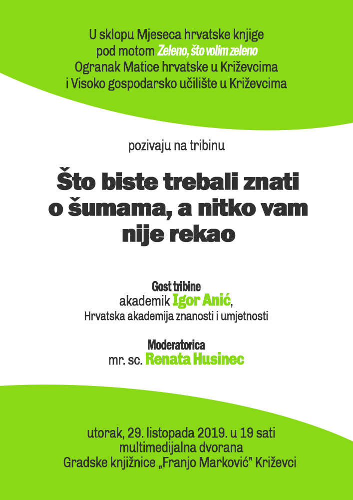 U utorak 29. listopada u 19 sati u Gradskoj knjižnici „Franjo Marković” održat će se druga tribina Ogranka Matice hrvatske u Križevcima i Visokoga gospodarskog učilišta tijekom Mjeseca knjige pod motom „Zeleno – što volim zeleno!”. Gost tribine bit će akademik Igor Anić i govorit će o temi „Što biste trebali znati o šumama, a nitko vam nije rekao”. Tribinu će moderirati mr. sc. Renata Husinec.