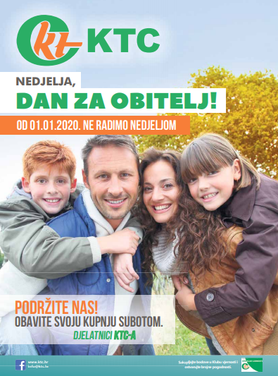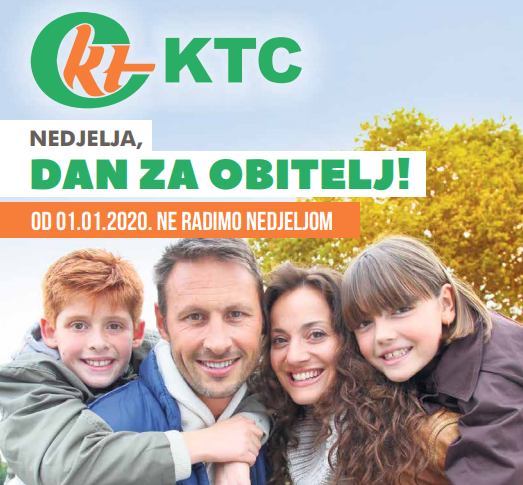 Kako je odlučeno, trgovački centri KTC će od 1.1.2020. prestati s radom nedjeljom, a sve pod motom “Nedjelja, dan za obitelj”.