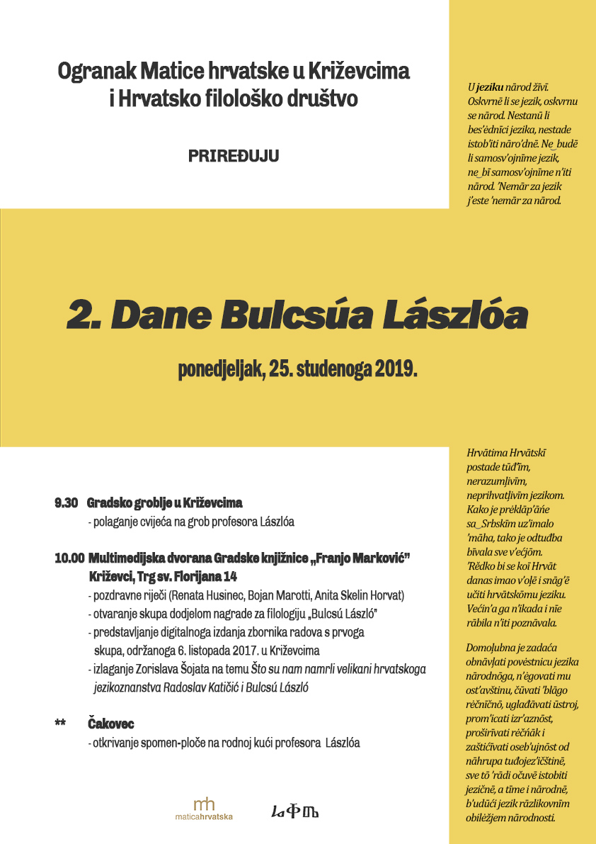 U ponedjeljak 25. studenoga 2019. Ogranak Matice hrvatske u Križevcima i Hrvatsko filološko društvo priređuju 2. Dane Bulcsúa Lászlóa.