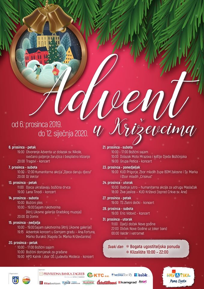 Otvorenjem Adventa u Križevcima, 6.12.2019. Križevcima će zavladati blagdanski božićni duh. Manifestacija će po treći put građanima ponuditi program unutar kojega i mlađi i stariji mogu pronaći nešto za sebe. Božićni ukrasi i dekoracije, klizalište s ledenom stazom oko fontane, škola klizanja za osnovnoškolce, ugostiteljska ponuda, te brojni glazbeni nastupi obilježit će program ovog Adventa.
