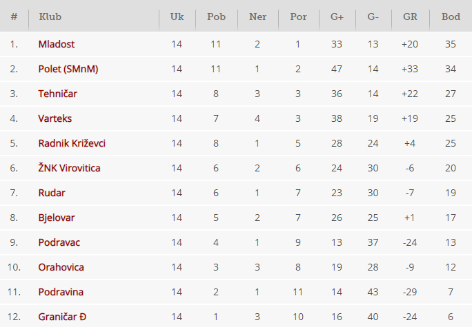Radnik Križevci u prvom dijelu prvenstva zauzeo je jako dobro peto mjesto s 25 osvojenih bodova, a sudeći po izgledu ljestvice, postoji dobra šansa da se u proljetnom dijelu prvenstva uključe u borbu za top 3.