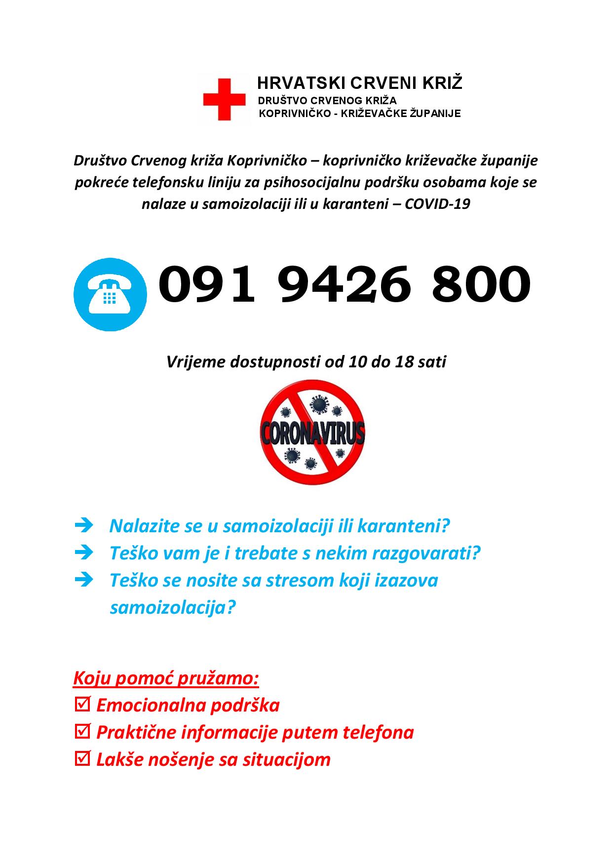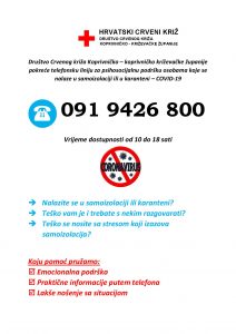 Društvo Crvenog križa Koprivničko-križevačke županije pokrenulo je telefonsku liniju za psihosocijalnu podršku osobama koje se nalaze u samoizolaciji ili u karanteni zbog koronavirusa. Ukoliko imate potrebe možete se obratiti za pomoć stručnjacima na telefonski broj 091 9426 800 koji je za sve građane dostupan od 10 do 18 sati. Stručne osobe koje dežuraju na telefonu pružit će vam emocionalnu podršku te praktične informacije kako se lakše nositi sa situacijom. Ovim putem još jednom apeliramo na odgovorno ponašanje i pridržavanje svih preporuka, mjera i uputa pridržavanja higijenskog standarda (temeljito pranje ruku, izbjegavanje rukovanja, dezinfekcija prostora) te izbjegavanje zadržavanja u prostorima u kojima boravi više ljudi, a sve u cilju kako bi se spriječilo potencijalno prenošenje koronavirusa.