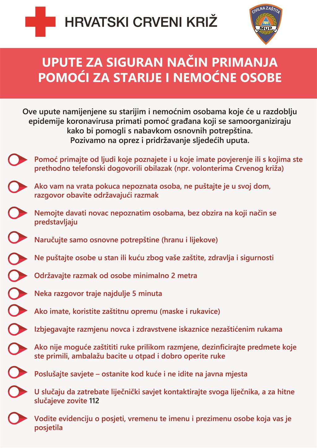 Stanovnike se moli da se pridržavaju svih propisanih mjera Nacionalnog stožera civilne zaštite, s posebnom pažnjom odnose prema najugroženijem dijelu stanovništva, starijim osobama. S obzirom na mnogo građana koji su se samoinicijativno uključili u pomoć svojim starijim susjedima u dostavi lijekova i proizvoda za održavanje zdravlja te nužnih namirnica, Crveni križ apelira da je u pružanju dobrosusjedske pomoći važno poštivati sljedeće mjere, a njih se pridržavaju zaposlenici i volonteri Crvenog križa: