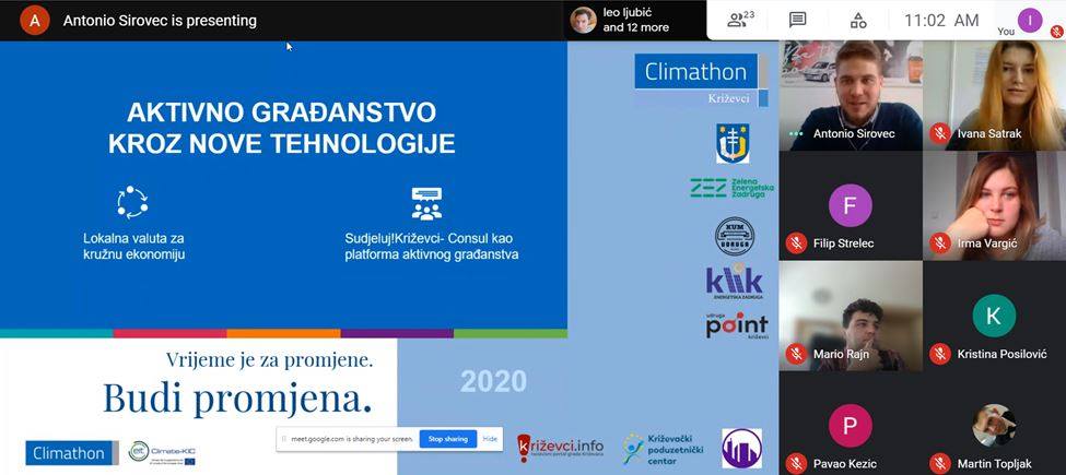 Dana 7.11.2020. u 11h započeo je prvi Climathon Križevci na temu „Aktivno građanstvo kroz nove tehnologije“. Četiri tima su, zajedno sa svojim mentorima, započela rad na rješenjima za prilagodbu na klimatske promjene našeg Grada. Pozdravni govor održala je Kristina Posilović, savjetnica ministra Ministarstva gospodarstva i održivog razvoja, istaknuvši važnost civilnog sektora i aktivnog građanstva u razvoju i napretku zajednice te svoju punu podršku u daljnjem radu. Gradonačelnik Mario Rajn je u svom govoru ohrabrio sudionike, zahvalio svima na uspješnoj organizaciji te iznio zadovoljstvo ovakvim aktivnostima koje okupljaju mlade našeg Grada.