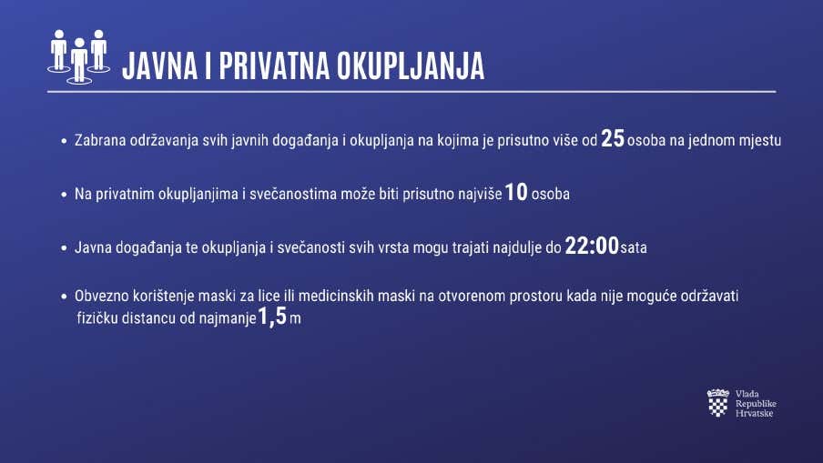 Nakon stalnog povećanja broja zaraženih koronavirusom, premijer Andrej Plenković predstavio je nove epidemiološke mjere koje stupaju na snagu u subotu 28. studenog. Na javnim okupljanjima, koja smiju trajati do 22 sata, smije biti do 25 osoba, za svakog posjetitelja moraju biti osigurana 4 kvadratna metra površine uz obaveznu dezinfekciju prostora. Privatna druženja ograničavaju se na najviše 10 osoba, a održavanje svadbi se zabranjuje.