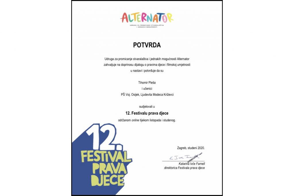 Tijekom listopada i studenoga održan je 12. Festival prava djece u organizaciji udruge Alternator, na kojemu su sudjelovali i učenici PŠ Vojakovački Osijek sa svojim učiteljem Tihomirom Plešom. Ove se godine zbog okolnosti festival održao online.