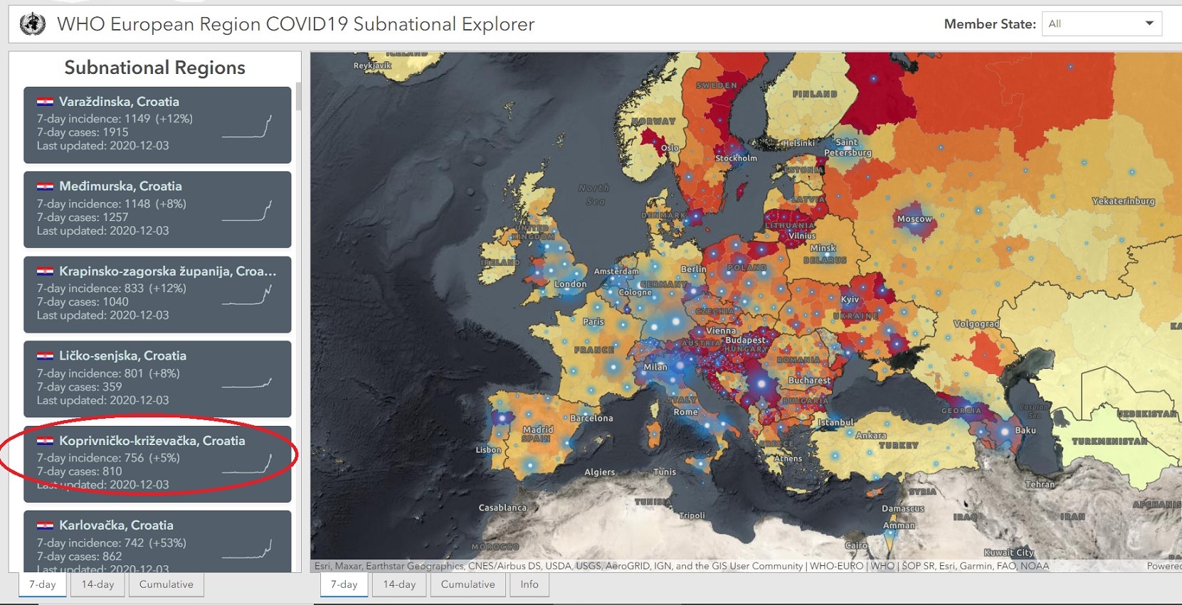 Koprivničko-križevačka županija nalazi se na petom mjestu od 101 regije u Europi po incidenciji, odnosno dinamici širenja korona virusa među stanovništvom u sedam dana, objavila je jučer Svjetska zdravstvena organizacija (WHO). Ispred nas su samo Varaždinska, Međimurska, Krapinsko-zagorska i Ličko-senjska županija, dok su sve druge hrvatske županije i sve druge regije u Europi iza nas. Na istom mjestu smo i na tablici incidencije u 14 dana, jedino su Međimurska i Varaždinska županija zamijenile mjesta.
