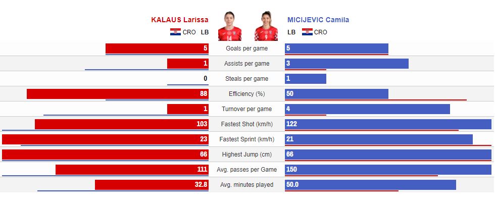 Naime, Larissa Kalaus je trenutno najbolji strijelac u redovima Hrvatske. Zabila je 15 golova u tri utakmice, jednako koliko i Ćamila Mičijević. No, Kalaus je prosječno po utakmici igrala tek 32.8 minuta, dok je Mičijević čak 50 minuta po dvoboju provodila na parketu.