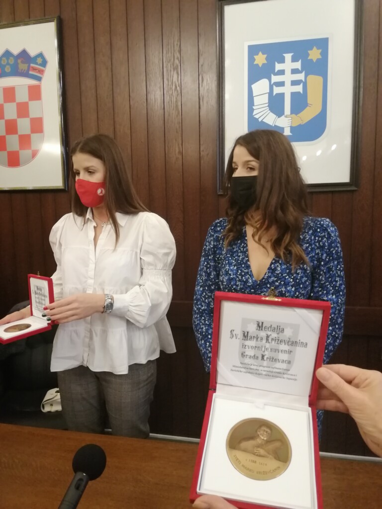 Križevčankama Dori i Larissi Kalaus, koje su na Europskom prvenstvu u rukometu zajedno s Hrvatskom ženskom rukometnom reprezentacijom osvojile brončanu medalju, danas je gradonačelnik Mario Rajn uručio još jednu – dobile su Medalju sv. Marka Križevčanina, izvorni suvenir Križevaca. Na prijemu u Velikoj gradskoj vijećnici križevačkim je kraljicama šoka i njihovim roditeljima čestitao na dosadašnjim uspjesima i rekao da je Grad na njih izuzetno ponosan.