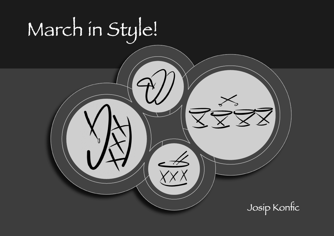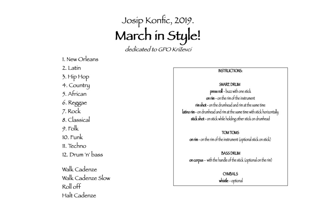 Konfic je ovih 12 kadenci za marširanje u različitim glazbenim stilovima posvetio Gradskom puhačkom orkestru Križevci, u kojimu je započeo svoje “udaraljkaške korake” te bio dugogodišnji član i suradnik. Kadence takve vrste može izvoditi gotovo svaki puhački orkestar pa je ova publikacija izdana na engleskom jeziku u nakladi 100 primjeraka i tiskana u Grafocentru Križevci.