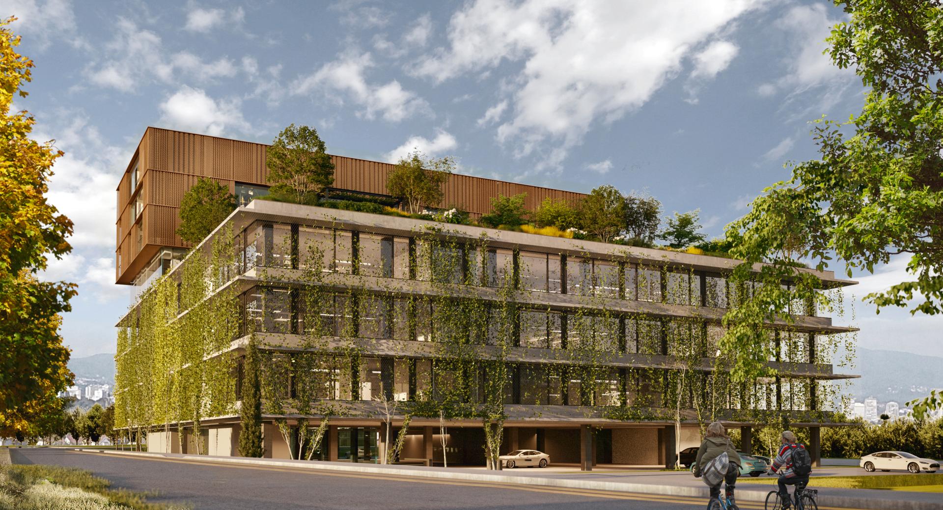 “Kombiniran je beton, staklo, metal i biljke. Primjerice, beton je takozvani vidljivi beton, koji je sam po sebi toliko fine teksture da se koristi za fasadu. Nije ga čak nužno niti obojiti. Staklo koje se koristilo za fasadu ima vrlo nisku refleksiju. To znači da je dobro za biljke u prostoru kampusa, ali isto tako i za ljude, jer i mi isto volimo sunce, a naročito u zimskom periodu. Međutim, tu uskaču biljke, koje na području do vrha trećeg kata, znači u dijelu zgrade koji je namijenjen poslovnim aktivnostima, preko ljeta stvaraju prirodan hlad. Znači, rade zelenu fasadu. Na gornjem dijelu objekta to se postiže s metalnim dekorativnim elementima, ali čija je funkcija i ta da pomogne u stvaranju pasivne toplinske zaštite”, pojašnjava Črček za Jutarnji list.