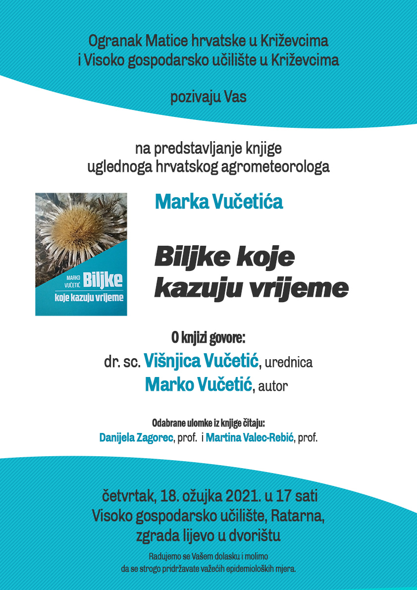 Ogranak Matice hrvatske u Križevcima i Visoko gospodarsko učilište u Križevcima pozivaju u četvrtak 18. ožujka 2021. u 17 sati na predstavljanje knjige uglednoga hrvatskog agrometeorologa Marka Vučetića Biljke koje kazuju vrijeme.