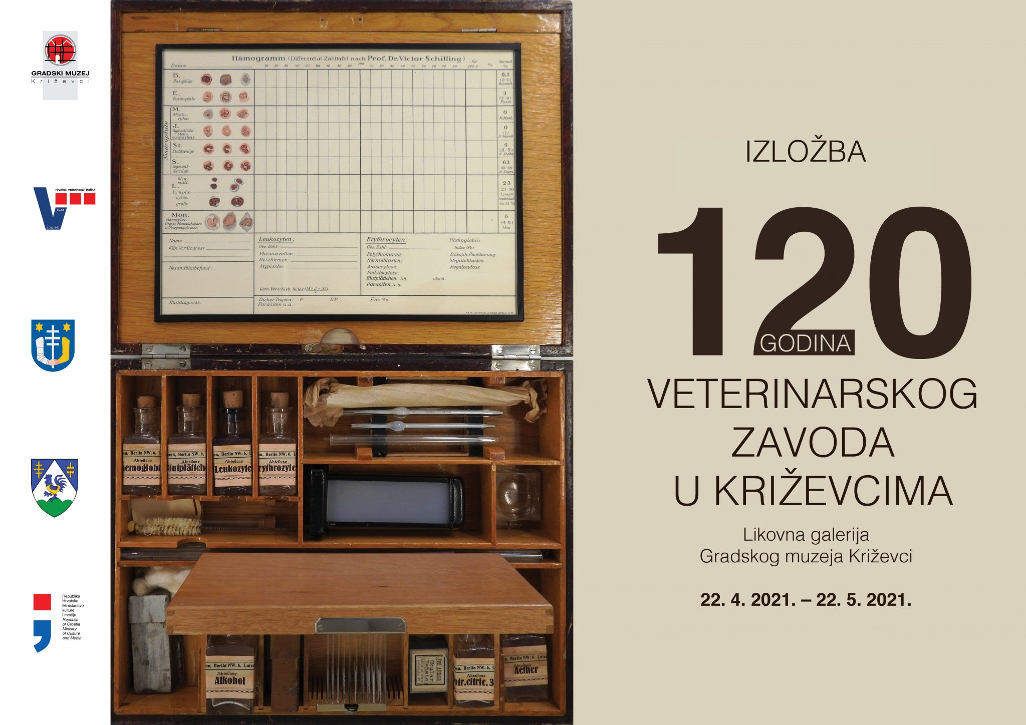 Izložba “120 godina Veterinarskog zavoda u Križevcima” u Likovnoj galeriji Gradskog muzeja Križevci moći će se razgledati do 22. svibnja 2021. svaki radni dan od 10 do 13 i od 18 do 20 sati, subotom od 10 do 12 sati, praznikom i blagdanom zatvoreno. Ulaz je besplatan.