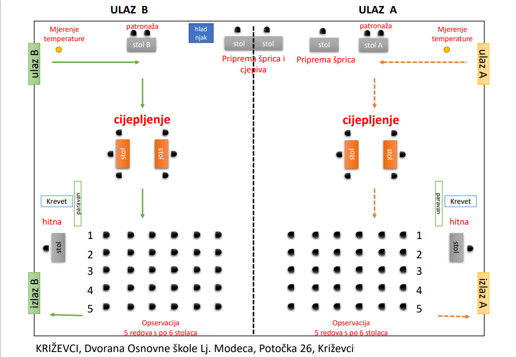 Punkt A – sjeverni ulaz (od strane Potočke ulice), cijepe se pacijenti sljedećih doktora: dr. Furmeg, dr. Črneli, dr. Berc, dr. Dbouk, dr. Cindrić, dr. Anđelić, dr. Kamenjašević, ZZJZ