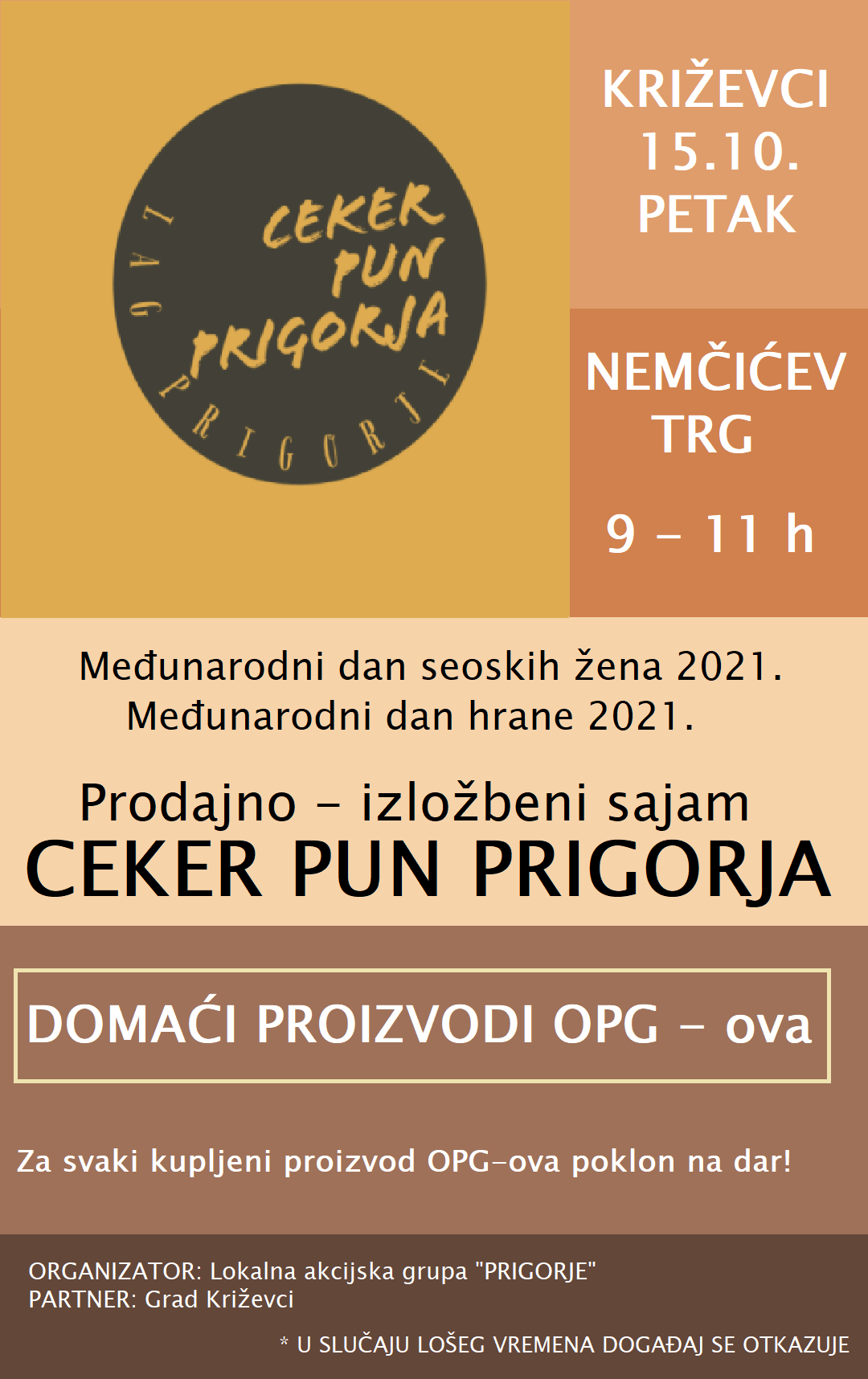 Povodom Međunarodnog dana seoskih žena i Dana hrane sutra će se u centru grada na Nemčićevom trgu predstaviti naše lokalne poljoprivrednice, OPG-ovke, obrtnice i članice udruga na malom prodajno-izložbenom sajmu pod nazivom “Ceker pun Prigorja”. Događanje organizira Lokalna akcijska grupa Prigorje i namjera im je promovirati aktivnosti žena koje svojim radom pridonose blagostanju svojih obitelji, razvoju gospodarstva na selima i očuvanju tradicije našeg kraja.