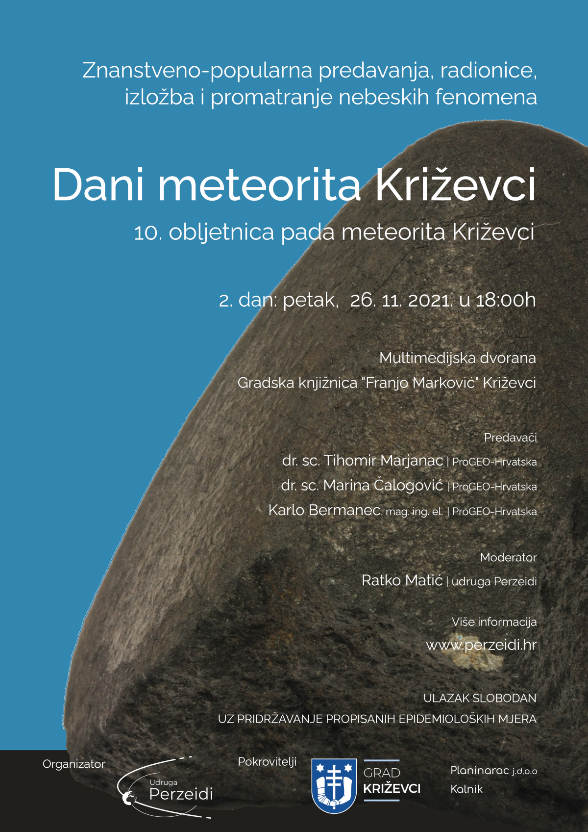 Križevačka astronomska udruga Perzeidi priređuje u petak, 26. studenoga navečer od 18 sati u Multimedijskoj dvorani Gradske knjižnice “Franjo Marković” već drugi niz predavanja, čak tri, u sklopu Dana meteorita Križevci kojima se obilježava deset godina od pada i pronalaženja meteorita Križevci.