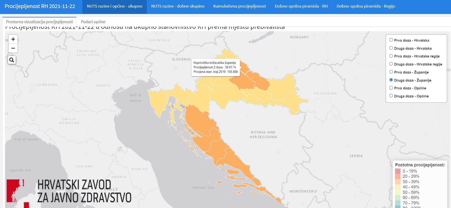 Prema podacima o procijepljenosti protiv covida za cijelu Hrvatsku koje je objavio Hrvatski zavod za javno zdravstvo, Koprivničko-križevačka županija ne stoji dobro. S 38.81 posto cijepljenog stanovništva, uz dalmatinske županije najlošiji smo u Hrvatskoj i lošiji od ionako loše statistike za cijelu zemlju u kojoj je cijepljeno tek 41.71 posto stanovništva. Najviše procijepljena je Varaždinska županija s 47.33 posto. Statistiku u našoj županiji popravljaju gradovi. Primjerice, u Križevcima je drugu dozu primilo malo manje od 41, u Koprivnici skoro 48 posto stanovništva, ali do općina cjepivo izgleda teže dolazi jer je u Svetom Petru Orehovcu i Gornjoj Rijeci cijepljena tek četvrtina i u Kalniku trećina stanovništva.