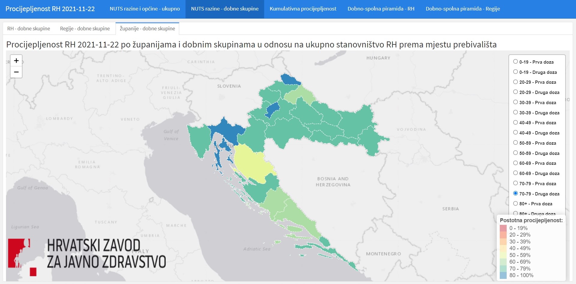 Ni druge brojke ne idu u prilog uspješnoj borbi protiv pandemije. Naša županija je sa 67.17 posto na dnu po procijepljenosti populacije od 70 do 79 godina, koju smo trebali najviše procijepiti još na početku kad je cjepivo došlo. Lošije od nas samo su Šibensko-kninska sa 66.72 i Ličko-senjska s 58.46, dok su naši sjeverni susjedi u Međimurskoj županiji cijepili 83 posto te populacije, Zagreb 82 ili Vukovarsko-srijemska županija 76 posto.