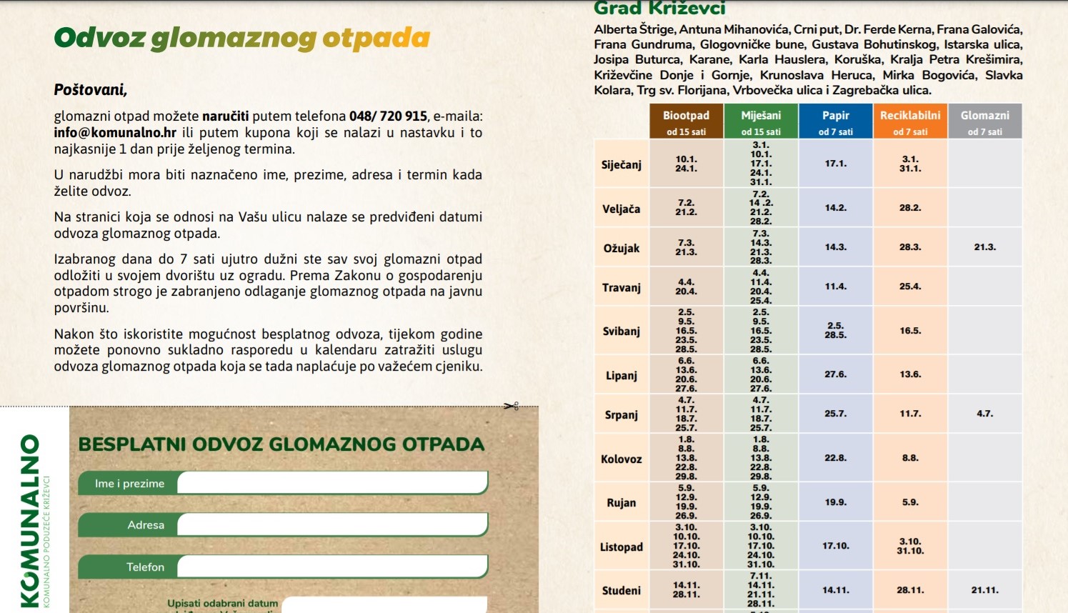 Komunalno poduzeće Križevci promijenilo je raspored odvoza otpada za pojedine ulice u gradu i to već od prvog dana siječnja. Razlog promjene je čisto praktičan – da grad bude uredniji i čišći. Tako se po novom, recimo, otpad u centru grada više neće odvoziti ponedjeljkom ujutro, nego utorkom pa ulice neće cijeli vikend biti zatrpane kutijama koje su trgovine i banke ostavljale subotom po završetku radnog vremena. Isto tako iz Markovićeve, u kojoj se otpad vozio petkom kad bi se stvarale gužve zbog povećanog prometa iz okolnih sela prema gradu, po novom se vozi četvrtkom. Sve promjene objavljene su u Kalendaru odvoza koji se nalazi na stranicama Komunalnog poduzeća, a najavili su i druge novitete.