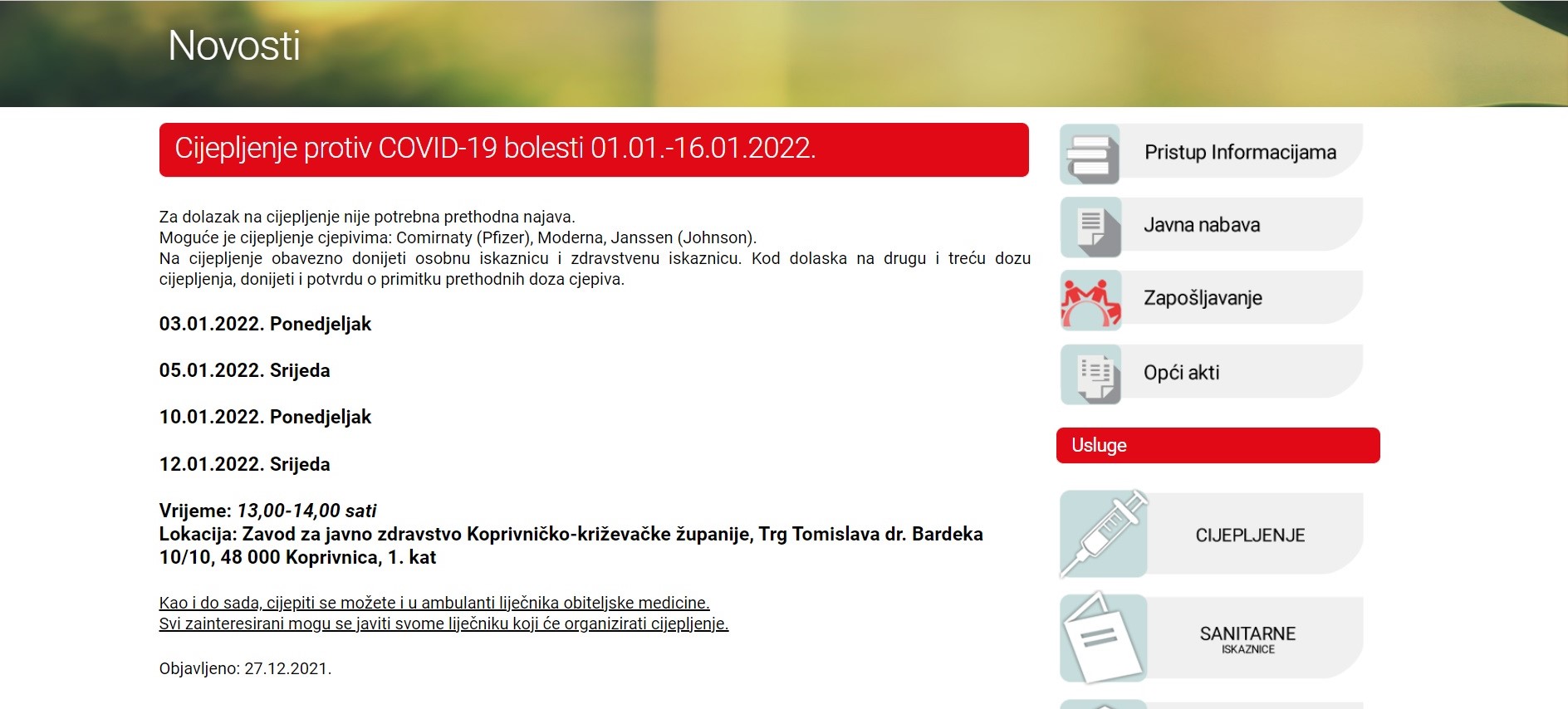 Cijepljenje bez prethodne najave do 16. siječnja u našoj županiji je moguće samo u Koprivnici u Zavodu za javno zdravstvo na Trgu dr. Tomislava Bardeka 10 ponedjeljkom i srijedom od 13 do 14 sati.