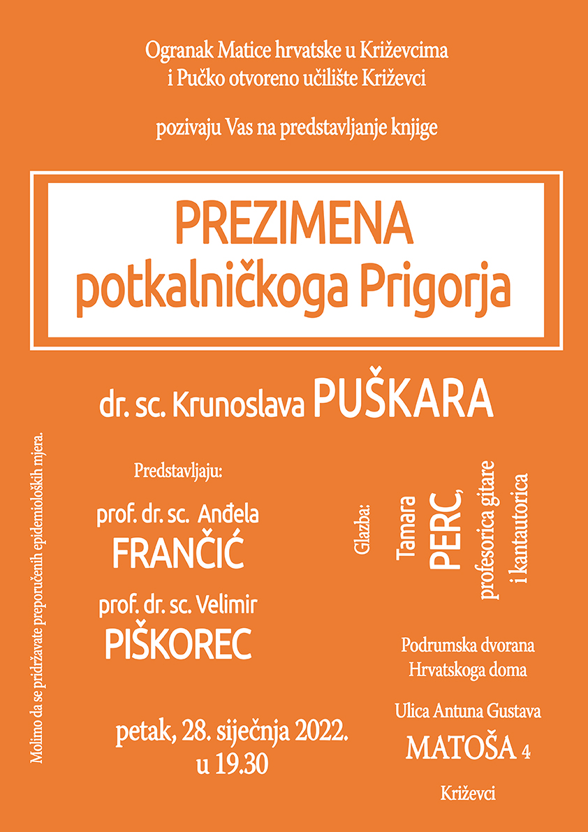 Iz različitih izvora uspio je potvrditi 1360 prezimena koja su se javljala u Križevcima i okolici od kraja 14. stoljeća do danas, ali i više od tisuću prezimena koja su se javila povremeno. Puškar se dosad u znanstvenom radu bavio različitim poljima lingvistike, a omiljena tema mu je istraživanje kajkavštine. Objavio je tridesetak znanstvenih i stručnih članaka u domaćim i međunarodnim časopisima i izlagao u zemlji i inozemstvu. Njegovu prvu knjigu predstavit će jezikoslovci zagrebačkog filozofskog fakulteta prof. dr. sc. Anđela Frančić i prof. dr. sc. Velimir Piškorec, dok će u glazbenom programu nastupiti kantautorica Tamara Perc.