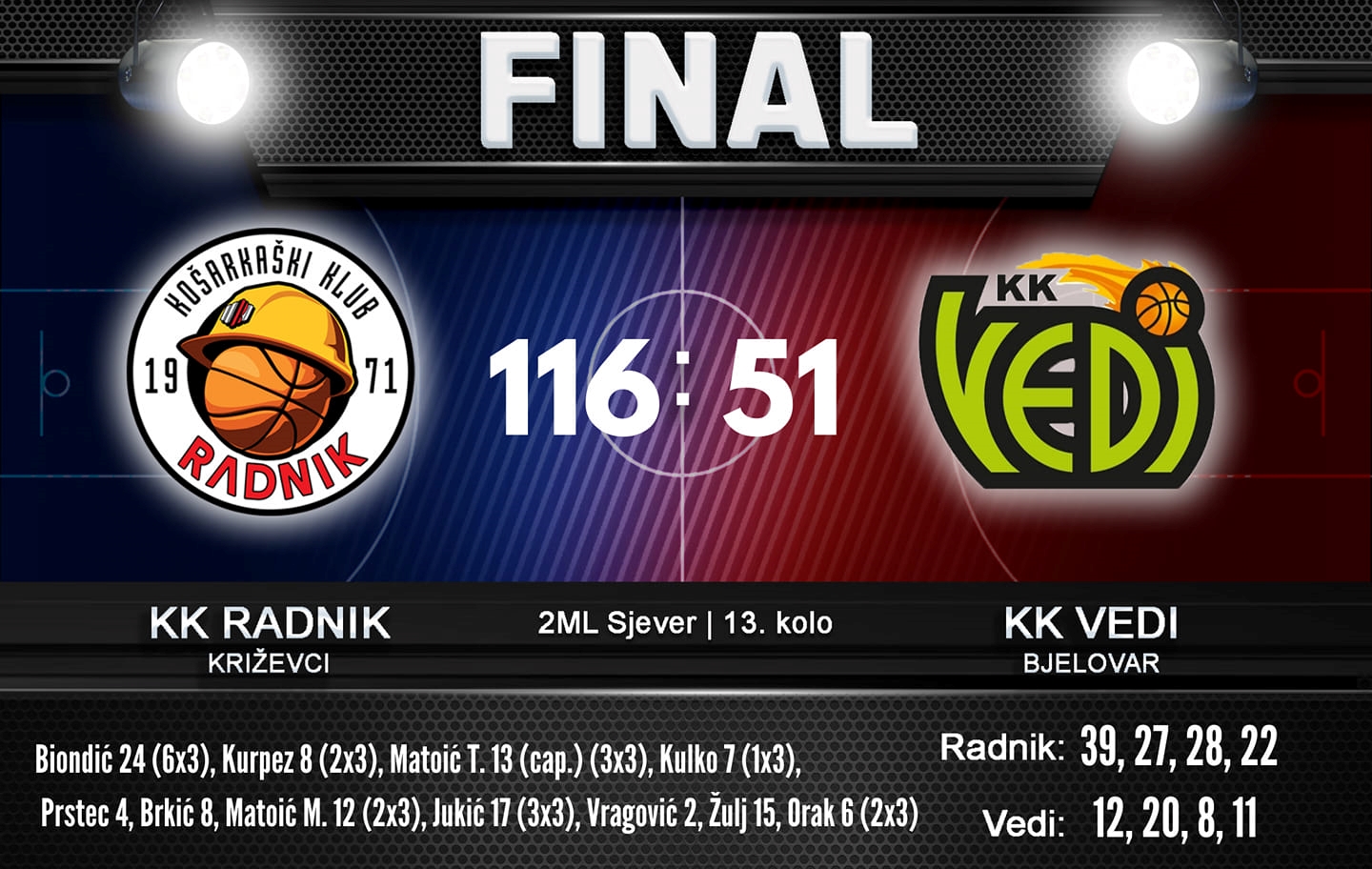 U prvoj utakmici nakon zimske stanke, košarkaši Radnika su u 13. kolu 2. muške lige Sjever u subotu, na domaćem terenu, pobijedili KK Vedi iz Bjelovara rezultatom 116:51. Već od prve četvrtine Križevčani su dominirali terenom, pogodili su 39 poena, a Bjelovarčani 12 i razlika se do kraja samo povećavala. U prvih deset minuta naši su košarkaši zabili i devet trica, od ukupno 18 tijekom utakmice, a čak petorica su ubacila dvoznamenkasti broj koševa.